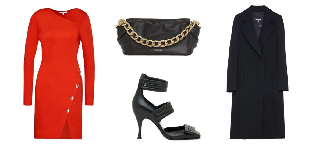Večernja varijanta ovoga puta potpuno je nadahnuta luksuznom elegancijom. Izgledajte originalno i autentično, birajući komade koji odišu ženstvenošću. Patrizia Pepe elegantna crvena haljina sa dekorativnim dugmadima izgledaće veoma upečatljivo, dok će njen asimetričan kroj cijelu kombinaciju učiniti još zanimljivijom. Kako bi haljina ostala vaš statement komad večeri, nosite je sa crnim komadima nešto svedenijeg izgleda i boja.