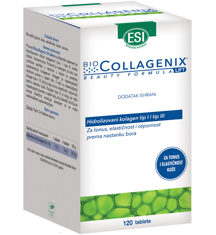 Proizvod Biocollagenix Lift, tablete je dijetetski suplement sa hidrolizovanim ribljim kolagenom tipa I i tipa III, visoke čistoće i koncentarcije. Kolagen koži daje tonus, elastičnost i otpornost prema nastanku bora.
